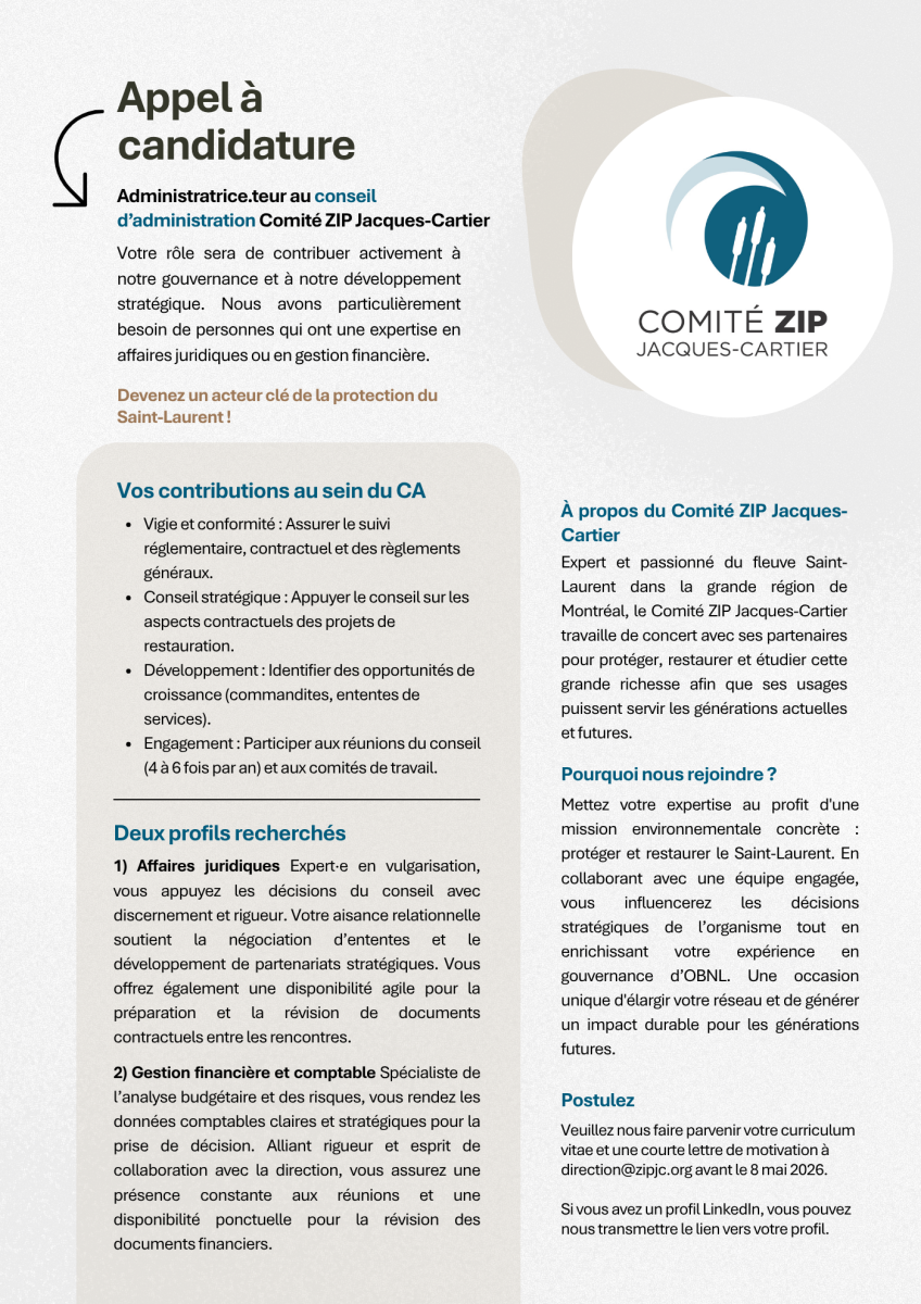 Vous souhaitez mettre votre expertise au service du fleuve ? Le Comité ZIP Jacques-Cartier recherche des administrateur·trices pour siéger à son conseil. Prenez part activement à nos décisions stratégiques et contribuez directement à la réalisation d'une mission environnementale d'envergure au cœur du Grand Montréal.